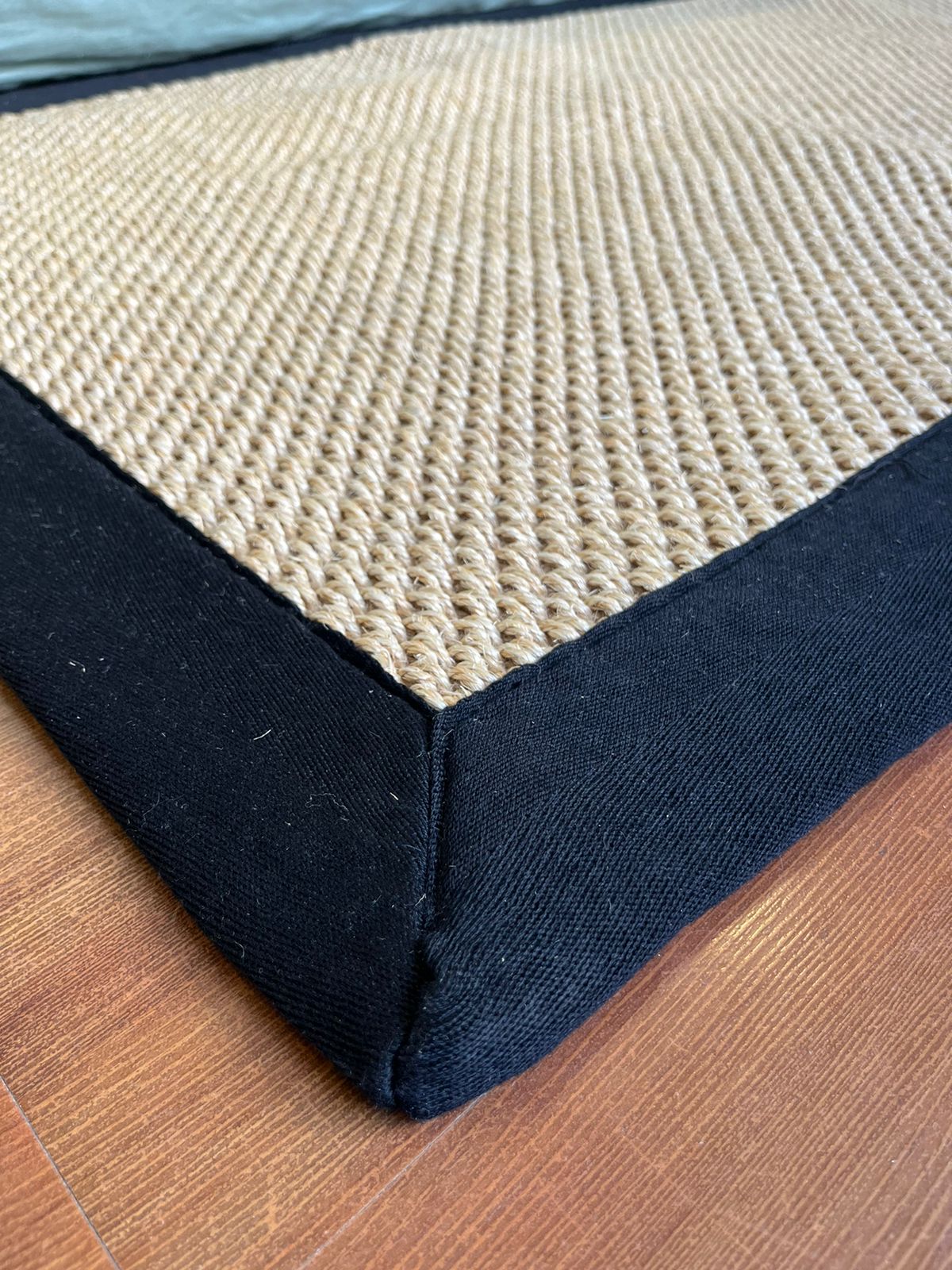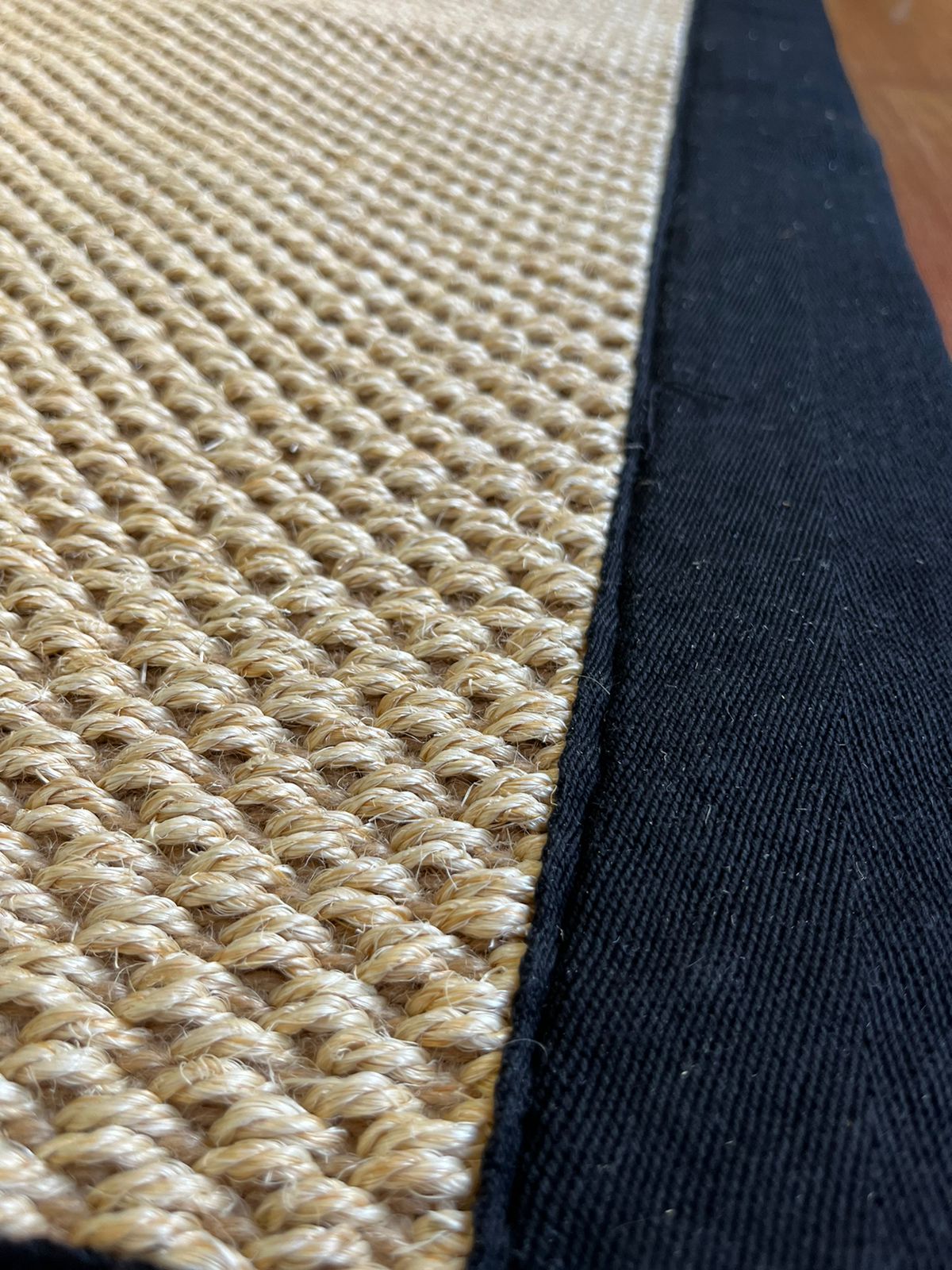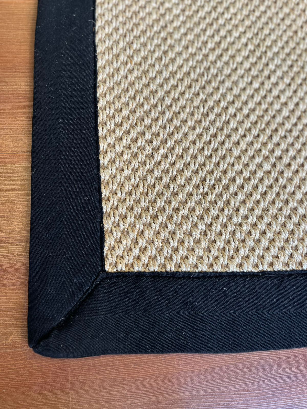 Material: Sisal Natural. Trama de tejido punto arroz fino en tono natural y borde de algodón negro en 8 cm.