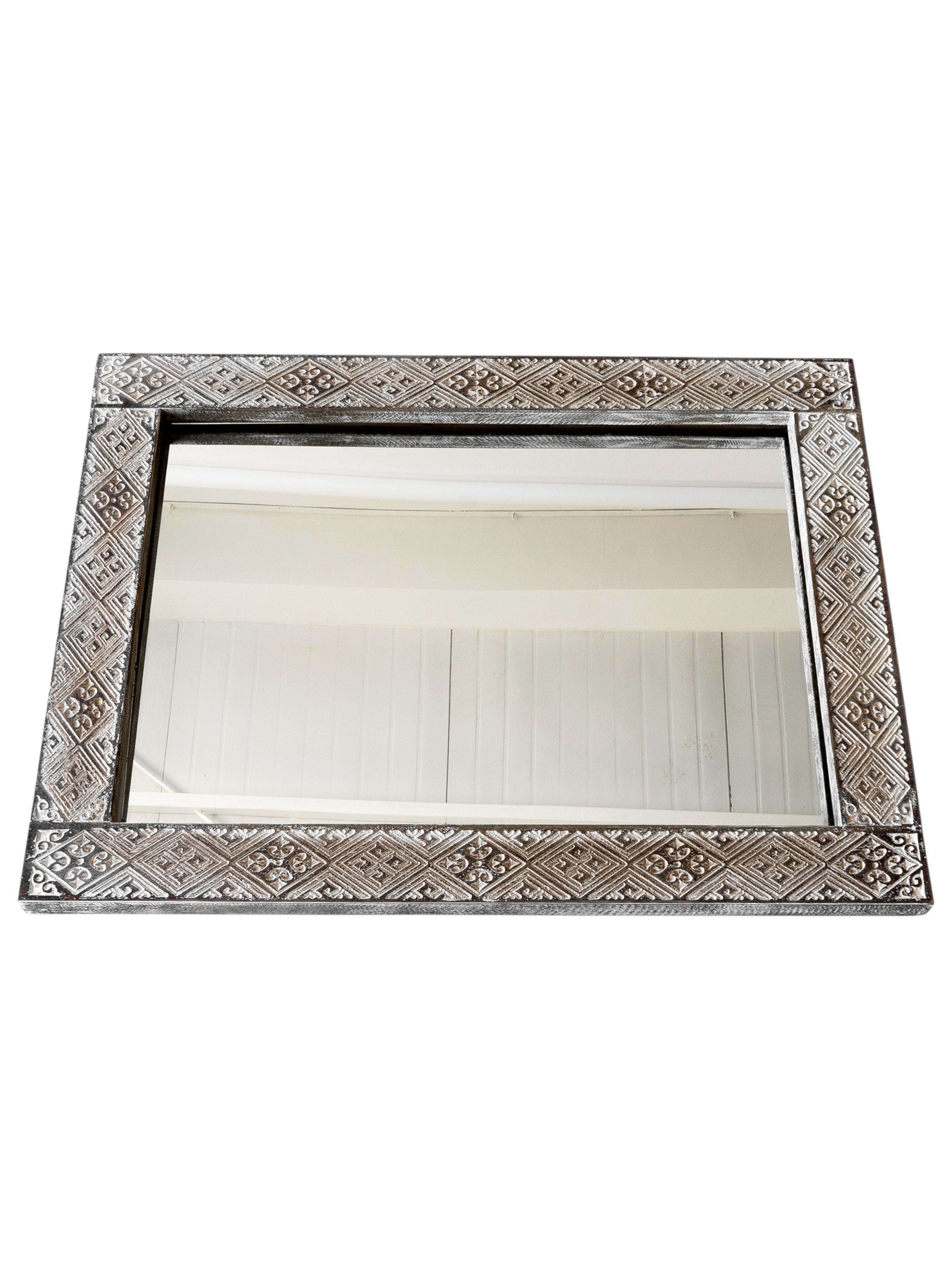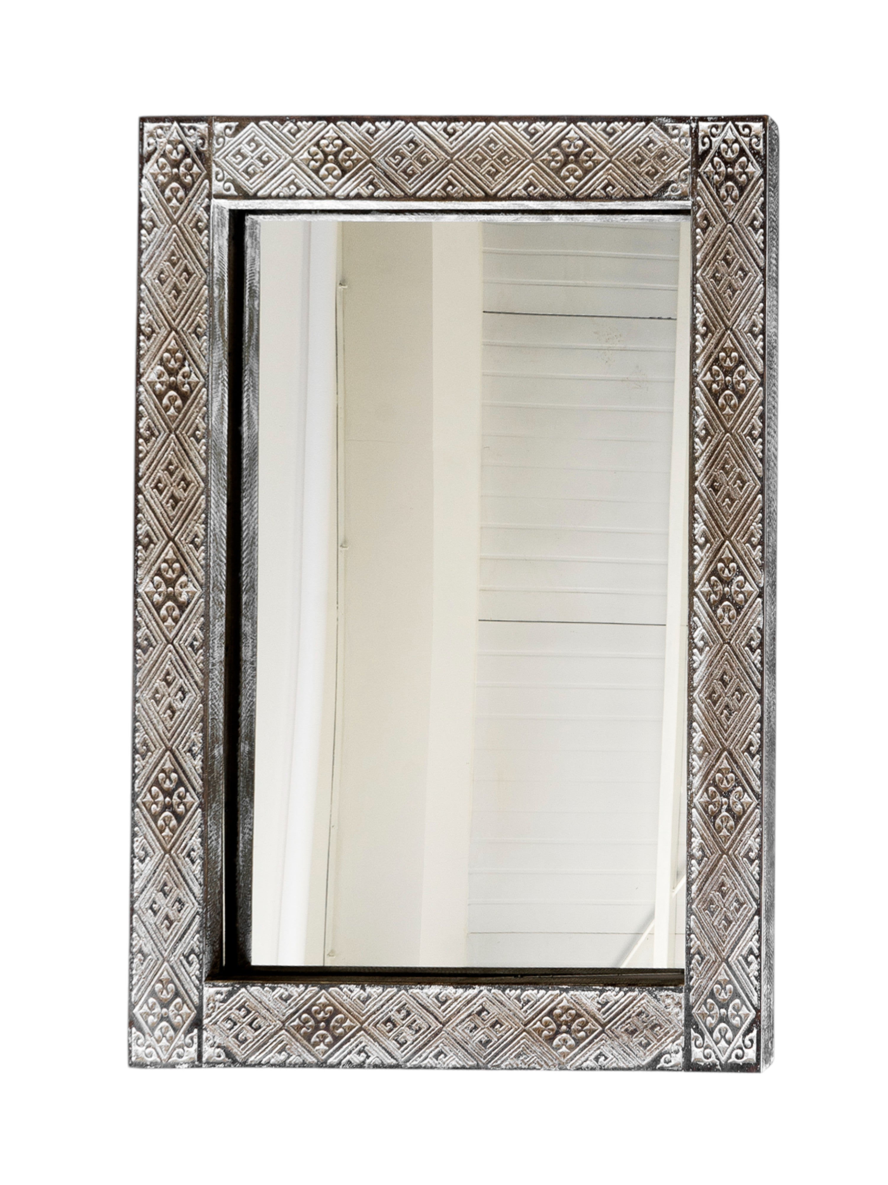 Espejo con marco tallado en madera de Suar pintado con sistema albayalde.la madera de Suar muy popular en países del sudoeste asiático por tener bondades como ser muy fuerte, duradero y fácil de tallar. También es altamente resistente a la reparación y termitas, solo requiere un mantenimiento básico, para destacar su belleza.