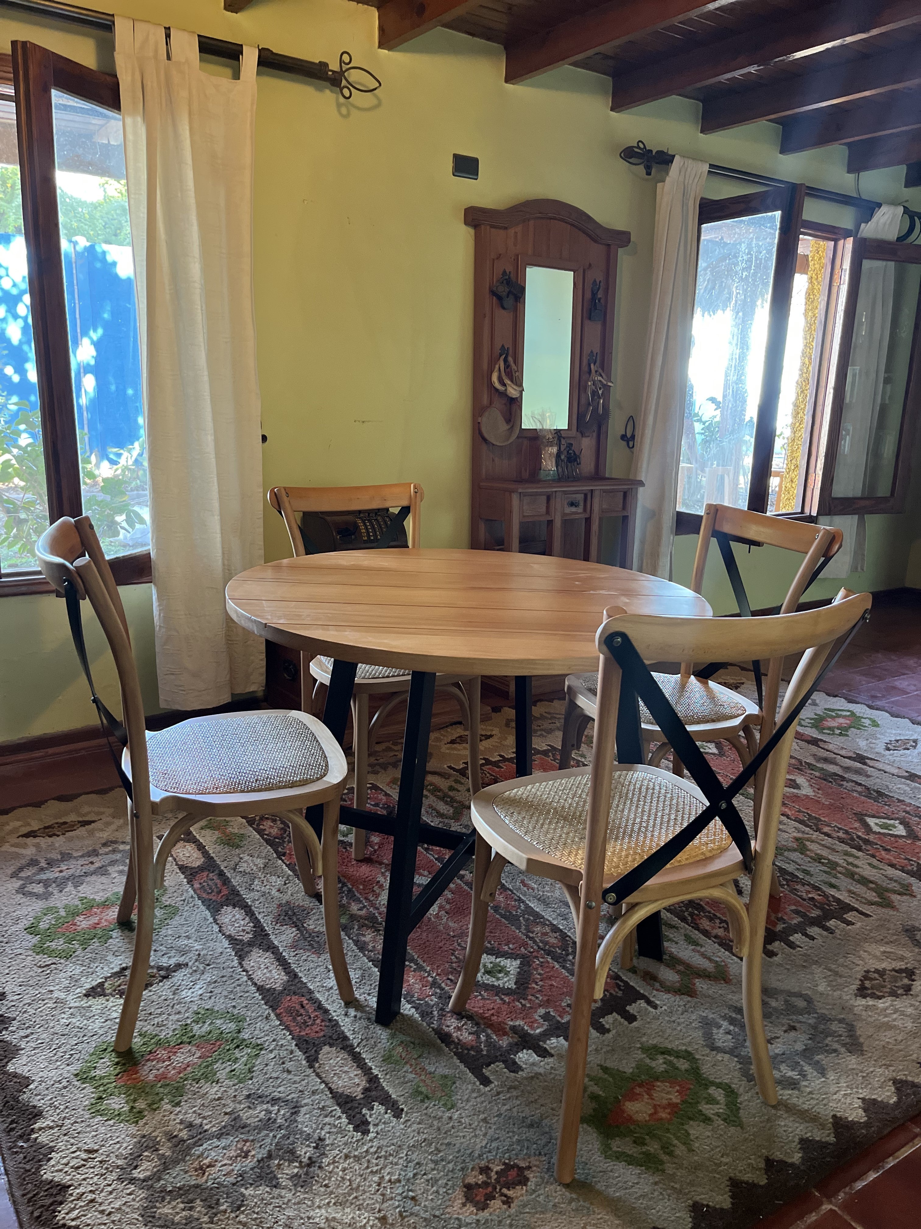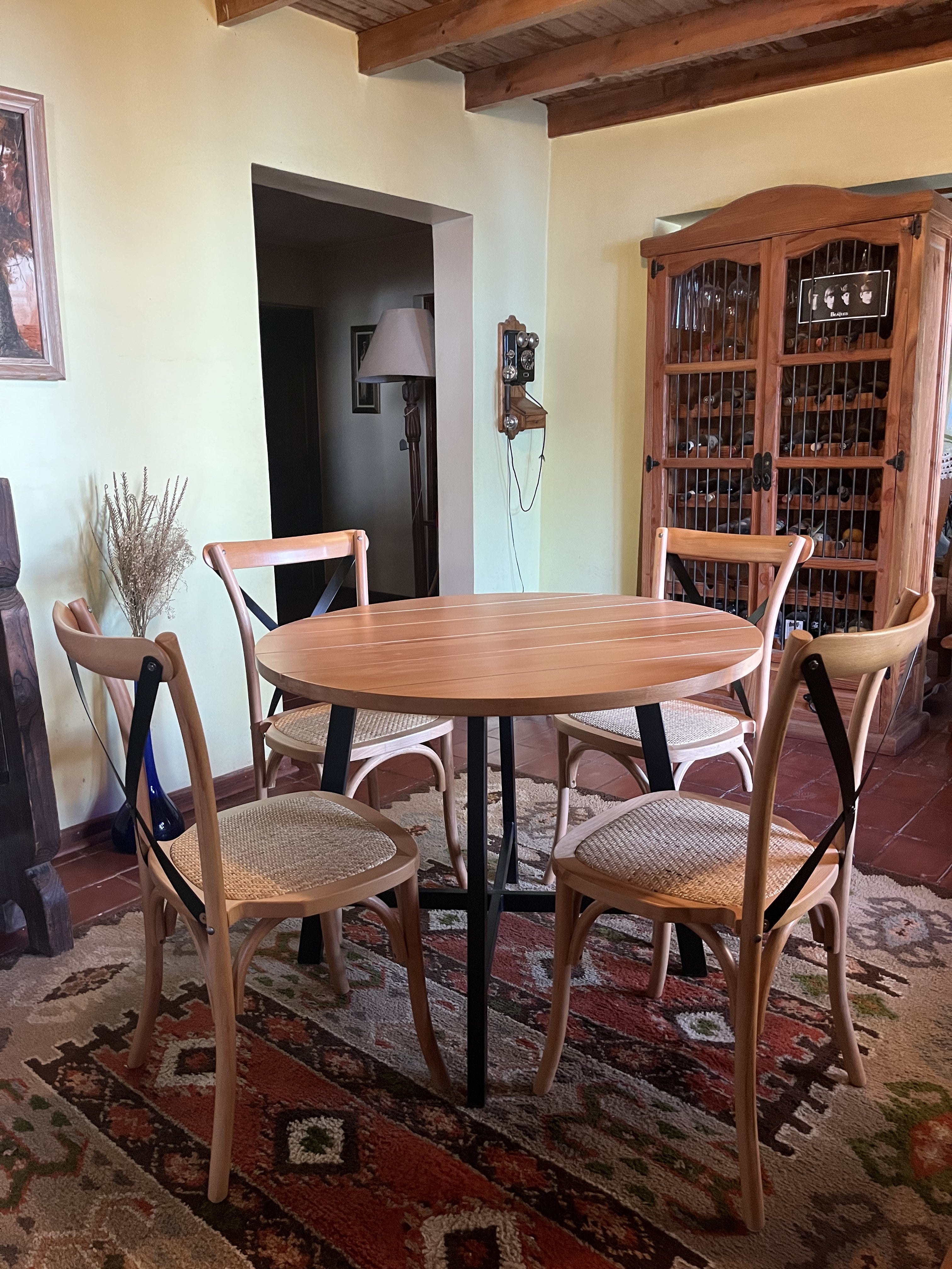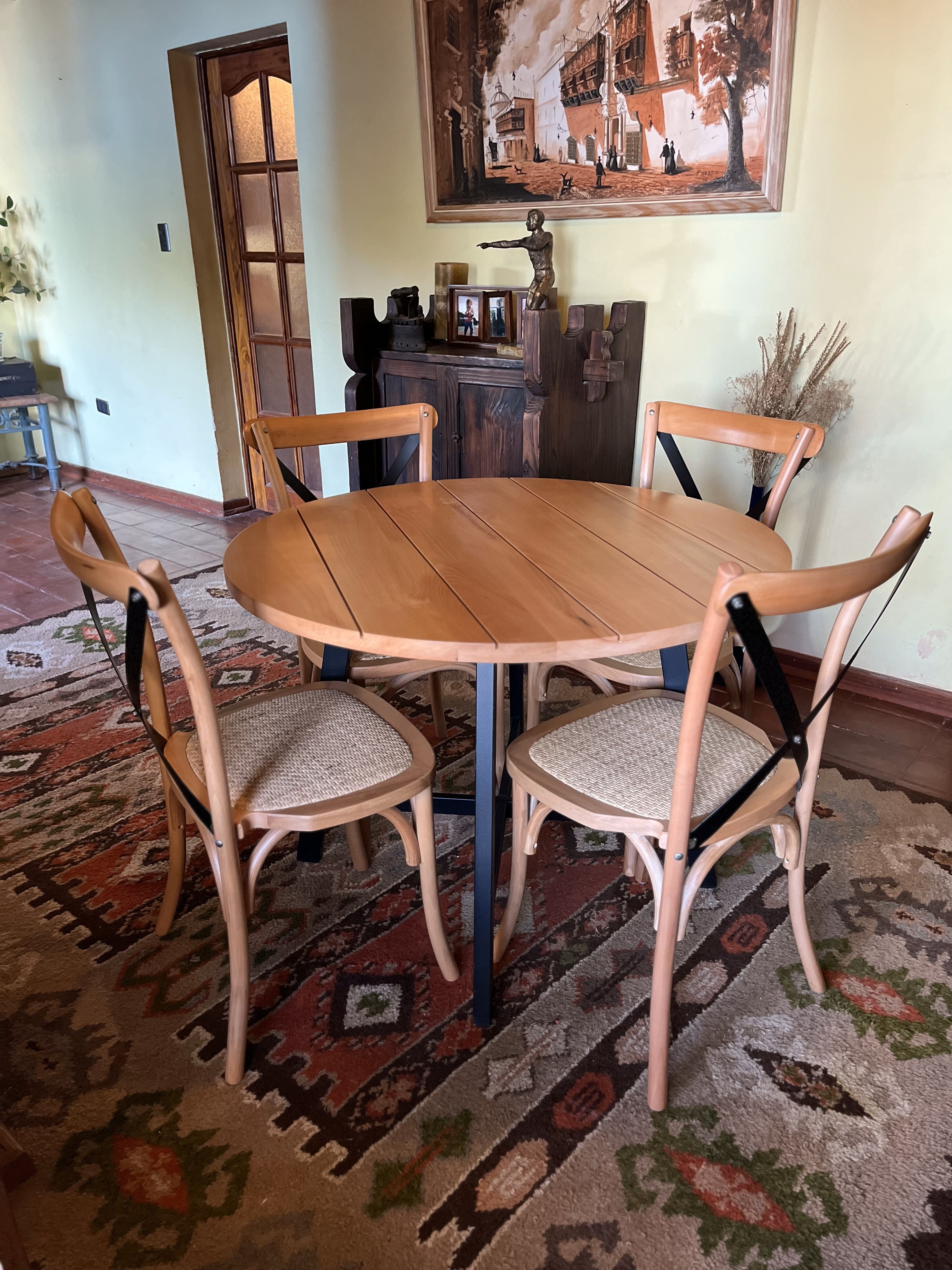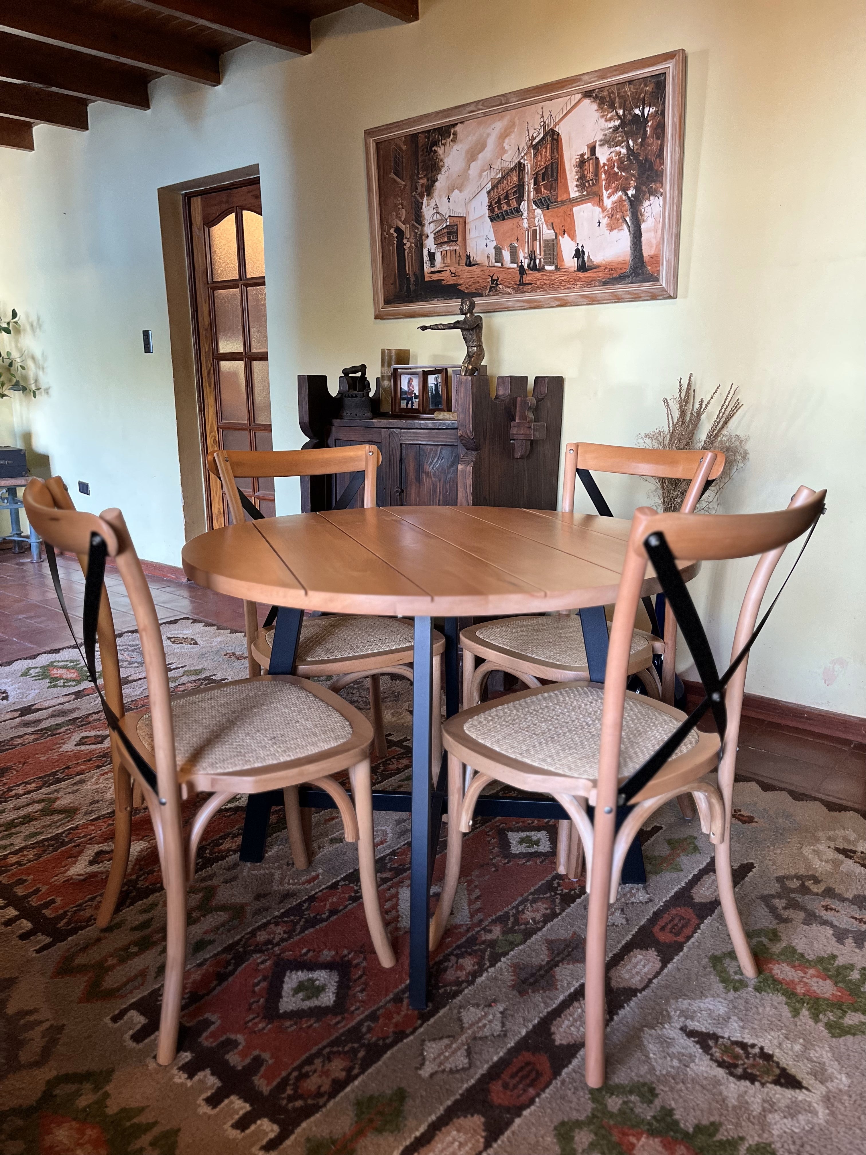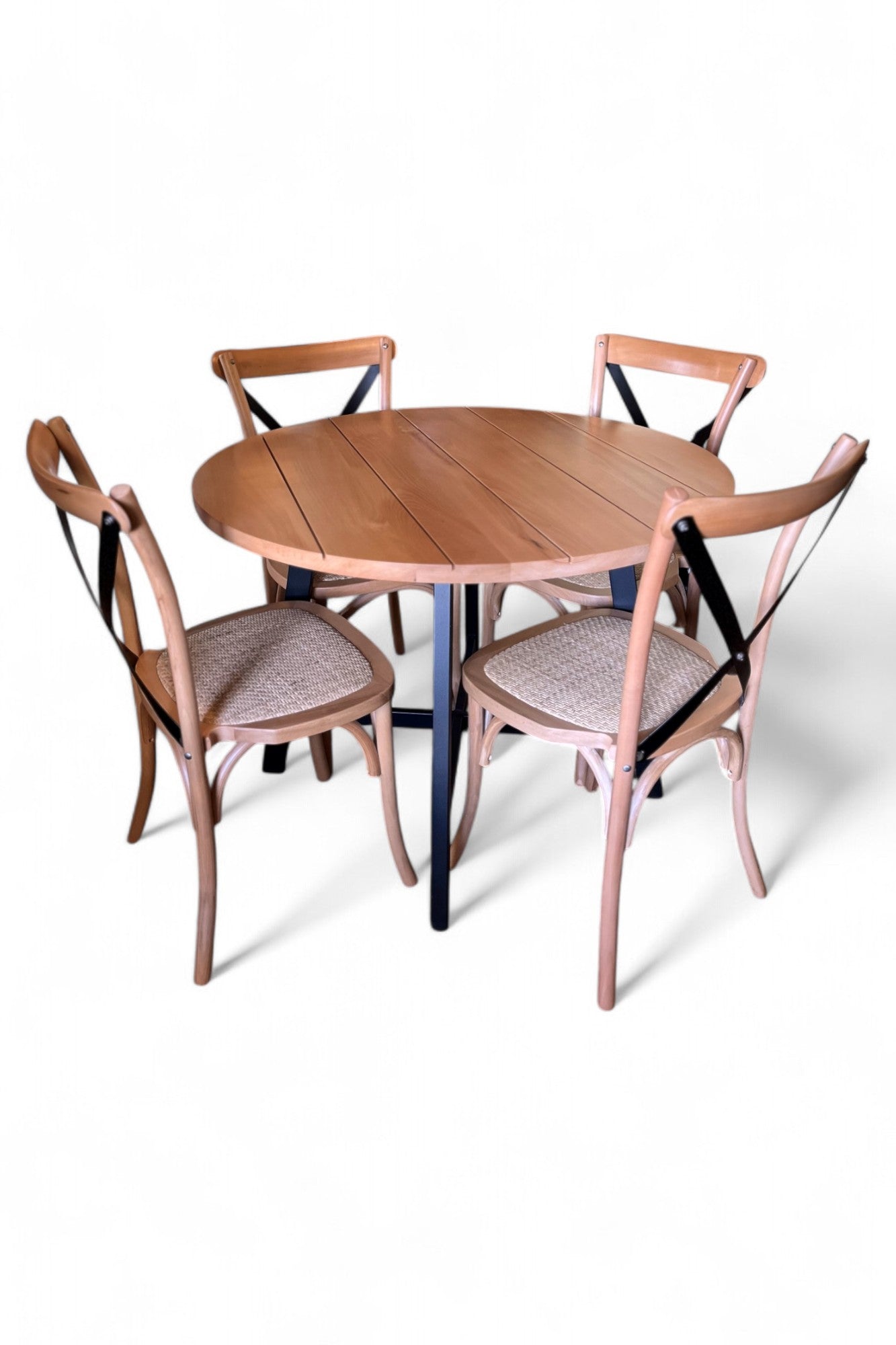 Mesa de Comedor Madera de Haya 100 cm de diámetro con diseño surco en su cubierta y cruceta en pie de base , con 4 sillas crossback naturales cruceta metálica negra