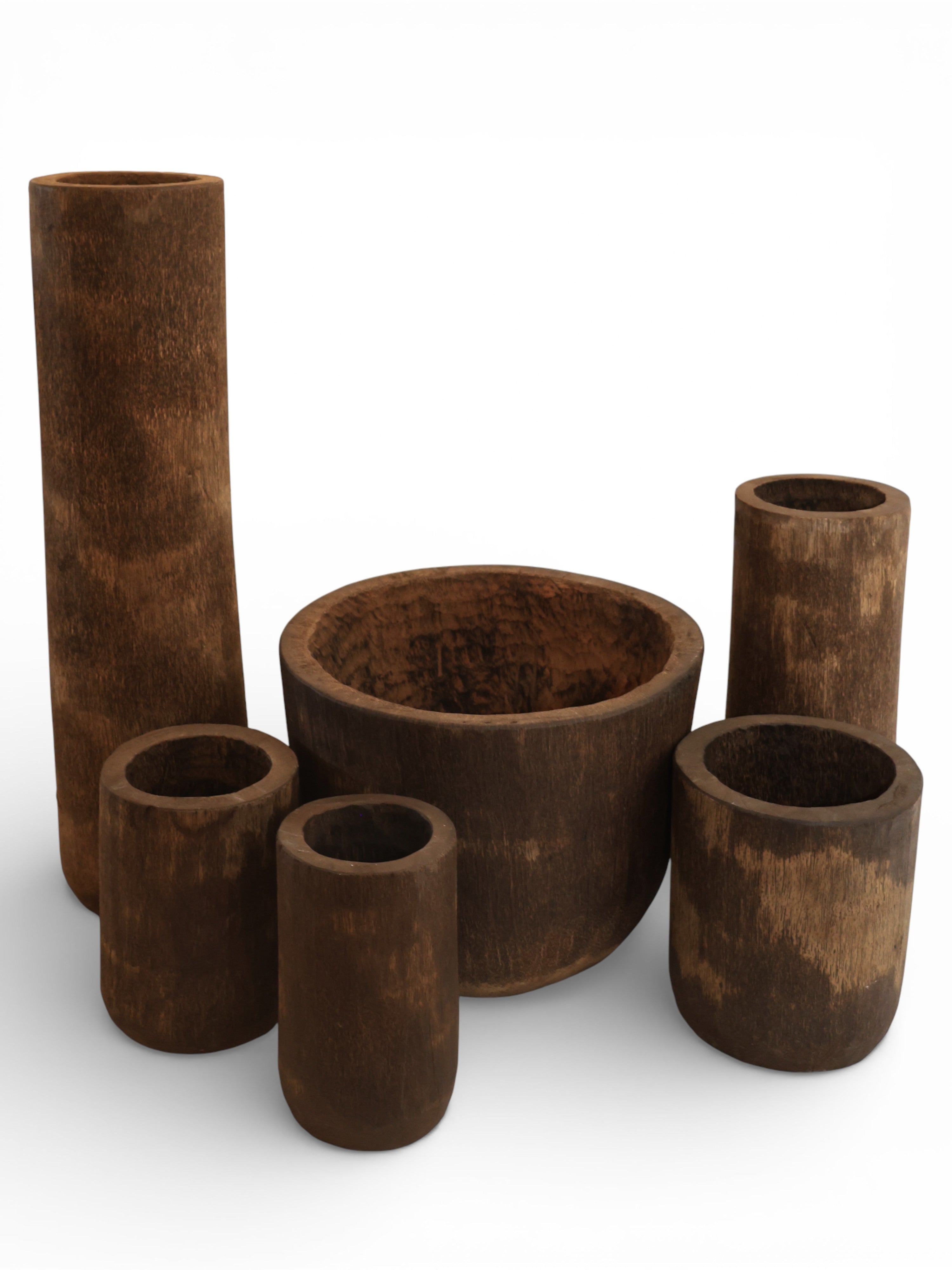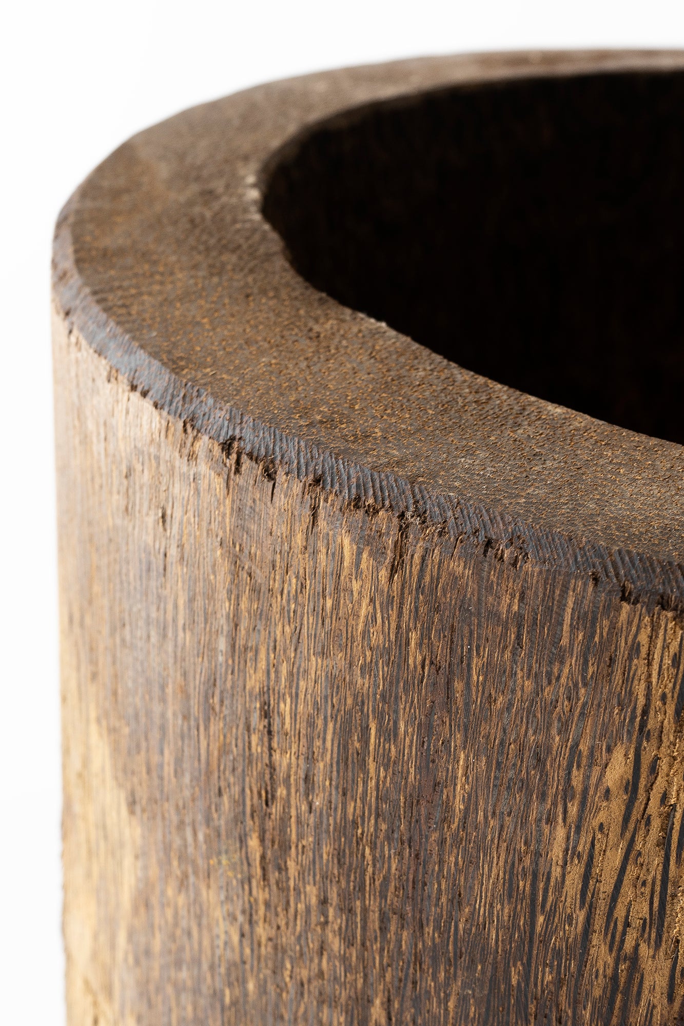 Macetas de madera de palmera de coco. La madera del tronco se utiliza para construir casas, puentes y muebles.