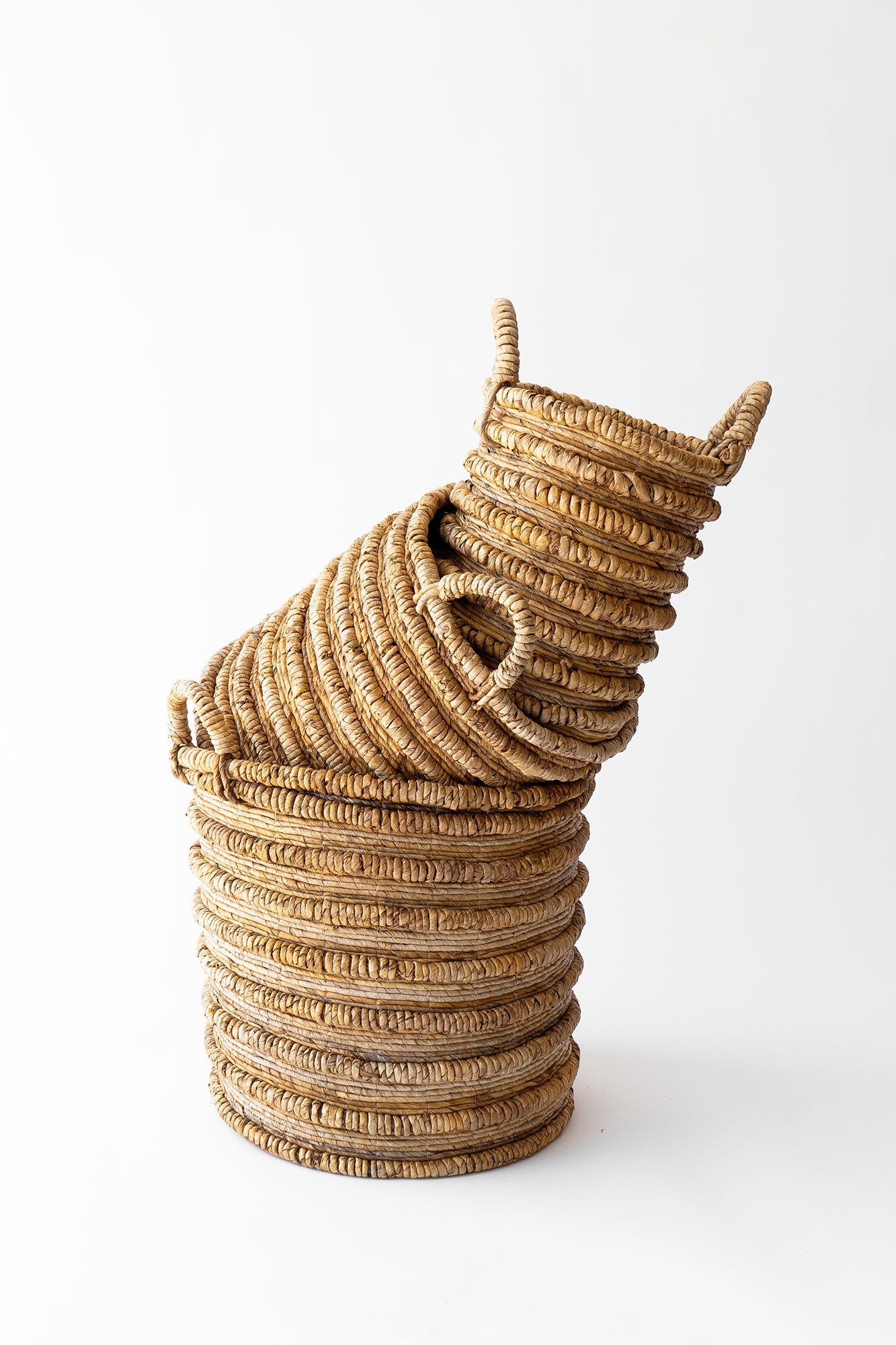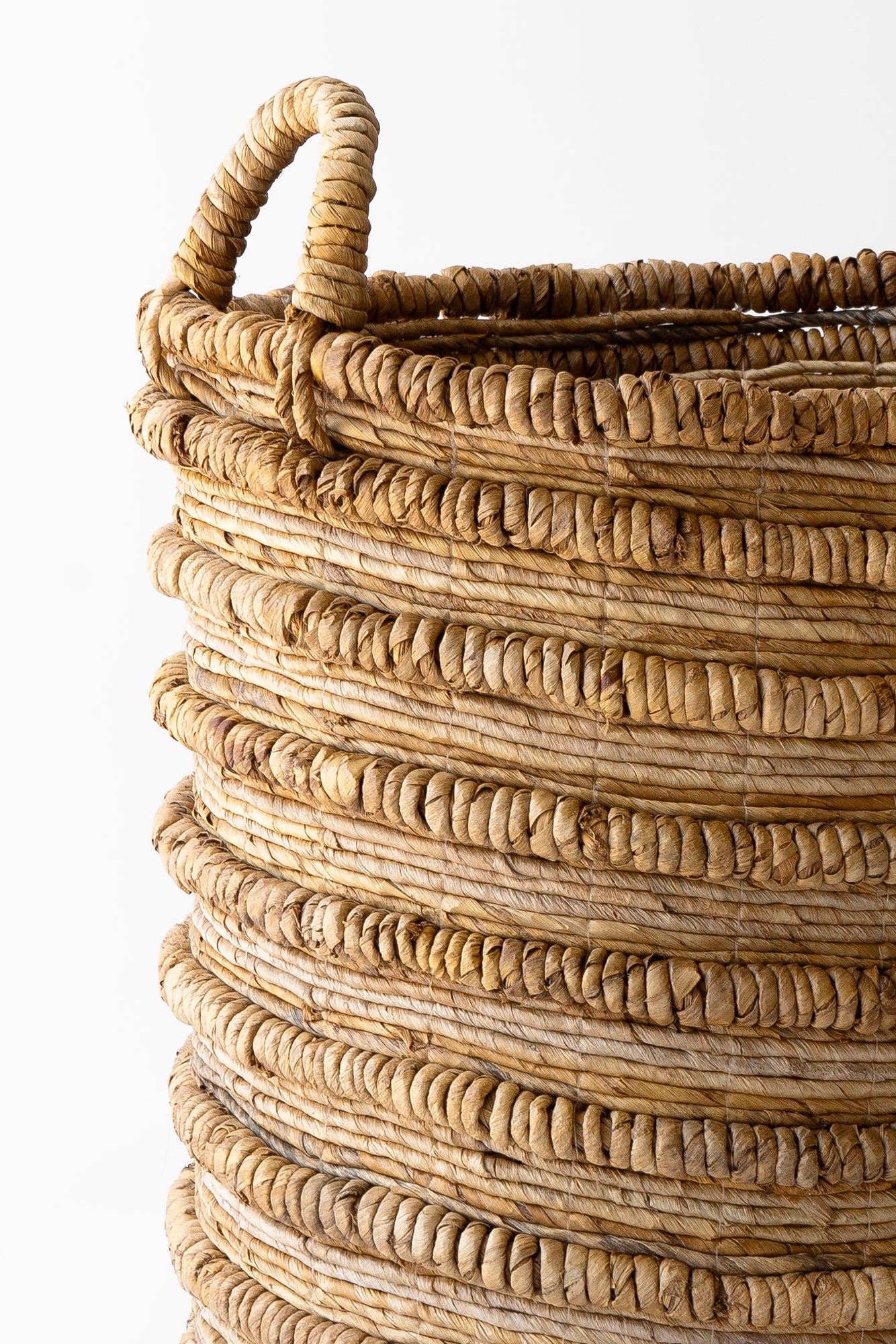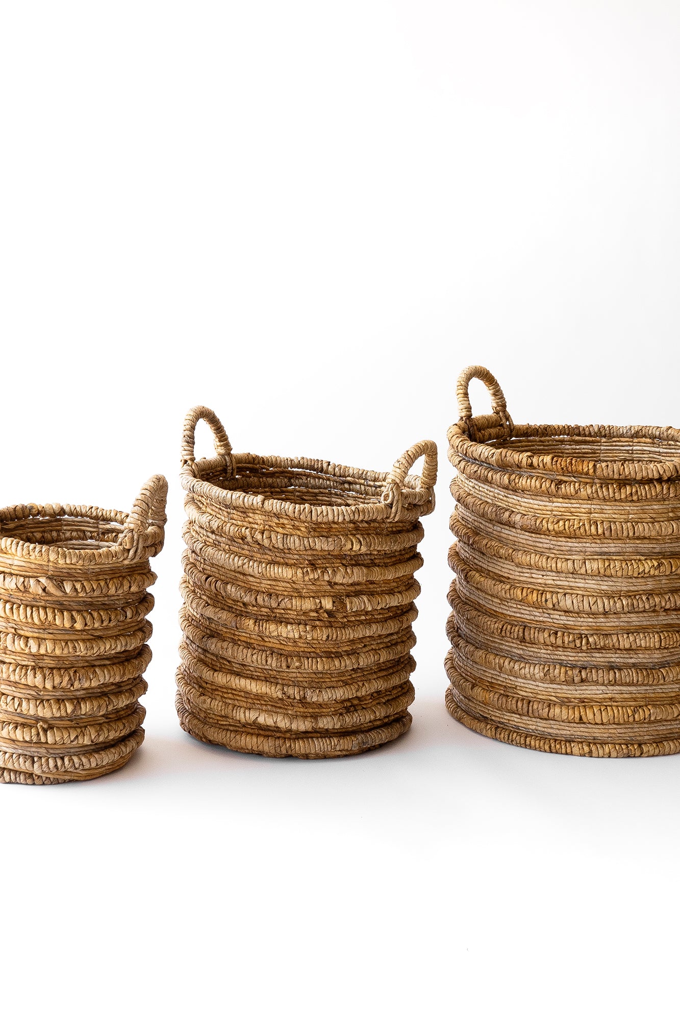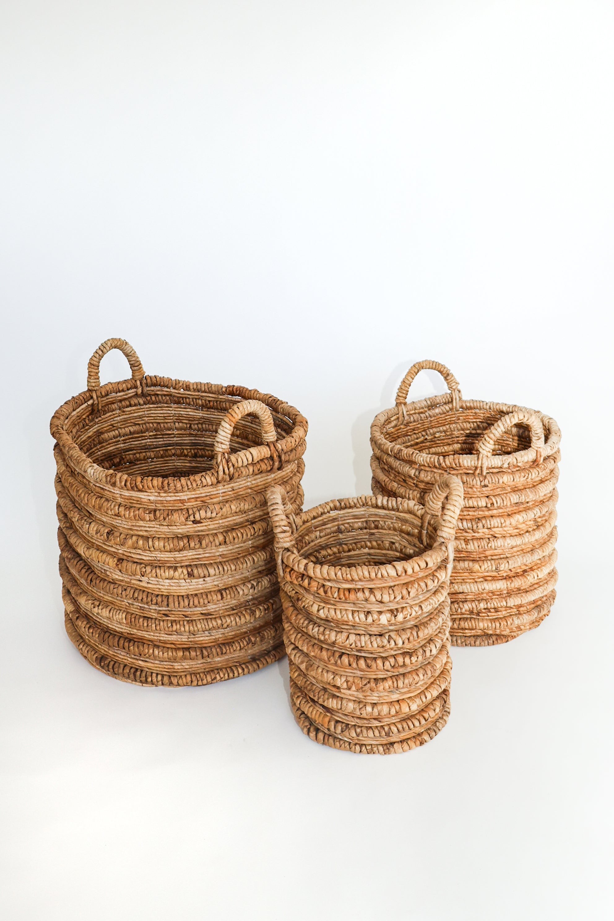 Pack de 3 Canastos de fibra de plátano con asas, extraída del pseudotallo de la planta de banano, utilizada para crear textiles sostenibles y otros productos, puedes darle muchos usos desde macetero hasta canasto de juguetes. conocidas por su resistencia y flexibilidad.