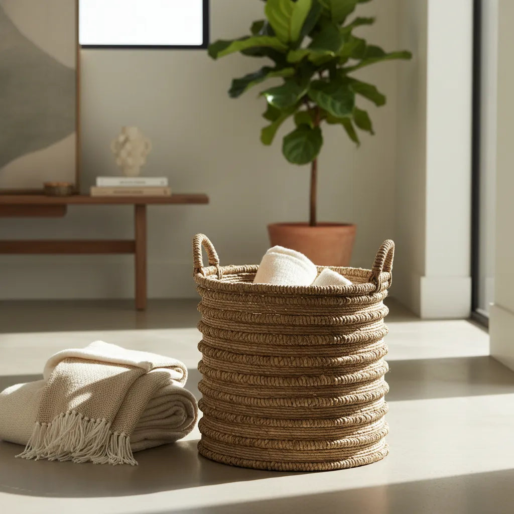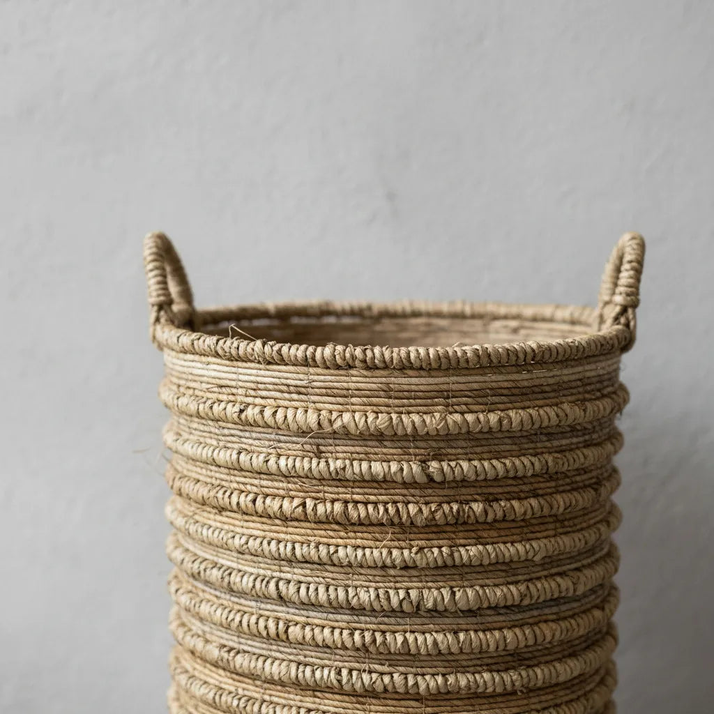 Pack de 3 Canastos de fibra de plátano con asas, extraída del pseudotallo de la planta de banano, utilizada para crear textiles sostenibles y otros productos, puedes darle muchos usos desde macetero hasta canasto de juguetes. conocidas por su resistencia y flexibilidad.
