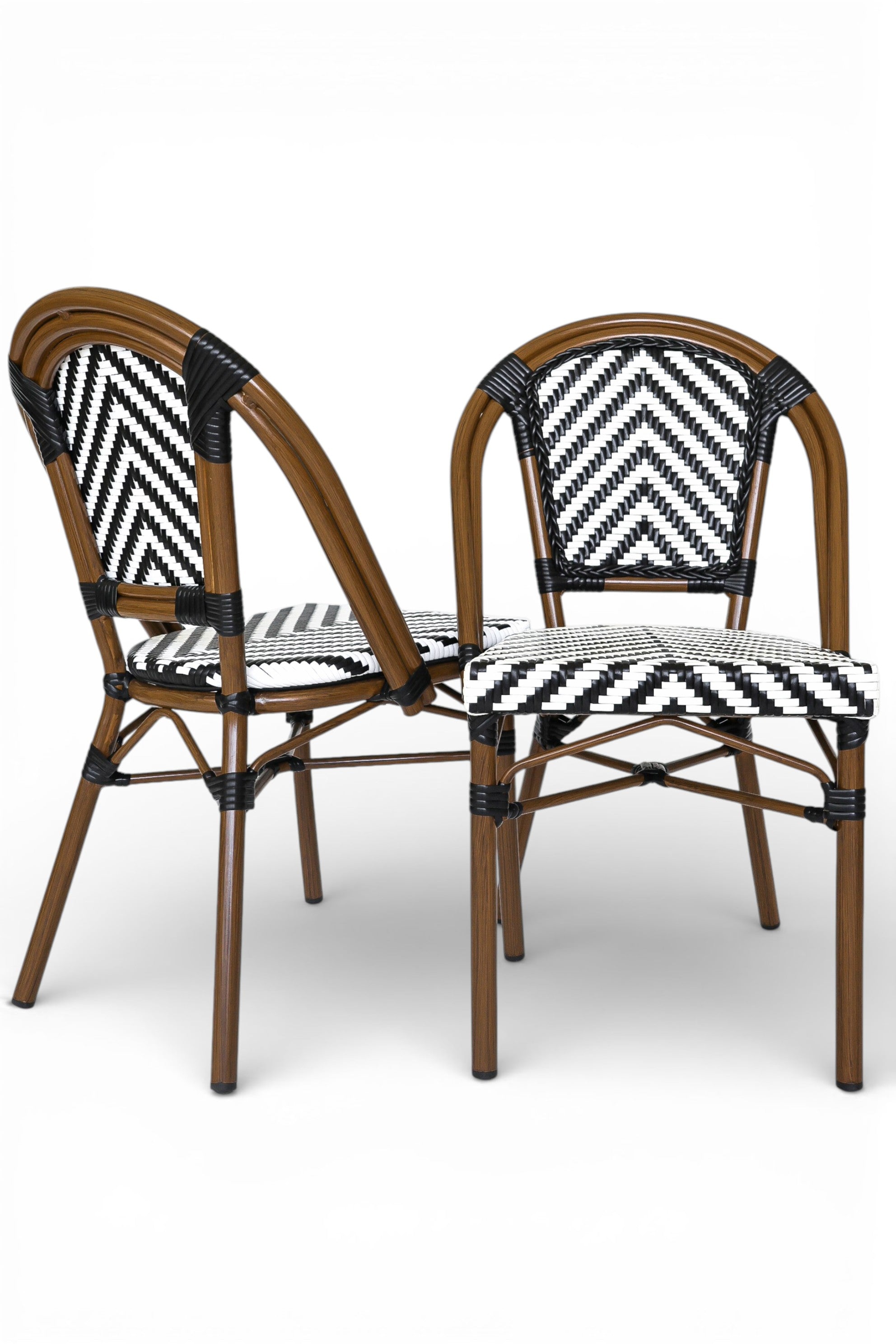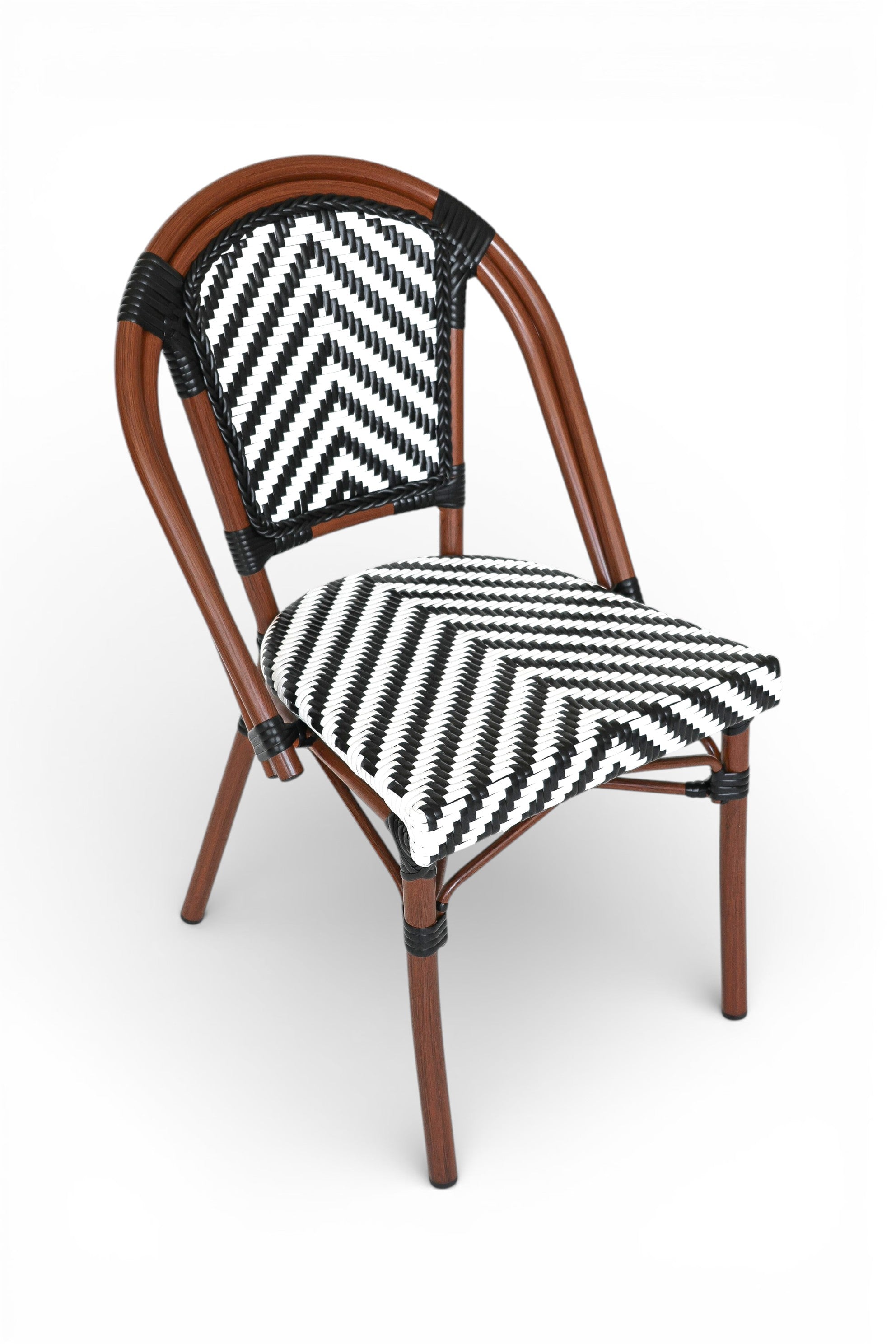 Materiales: Estructura de aluminio pintado símil madera con escuadra frontal. Asiento y respaldo tejido de ratán de PVC negro y blanco en forma de espiga