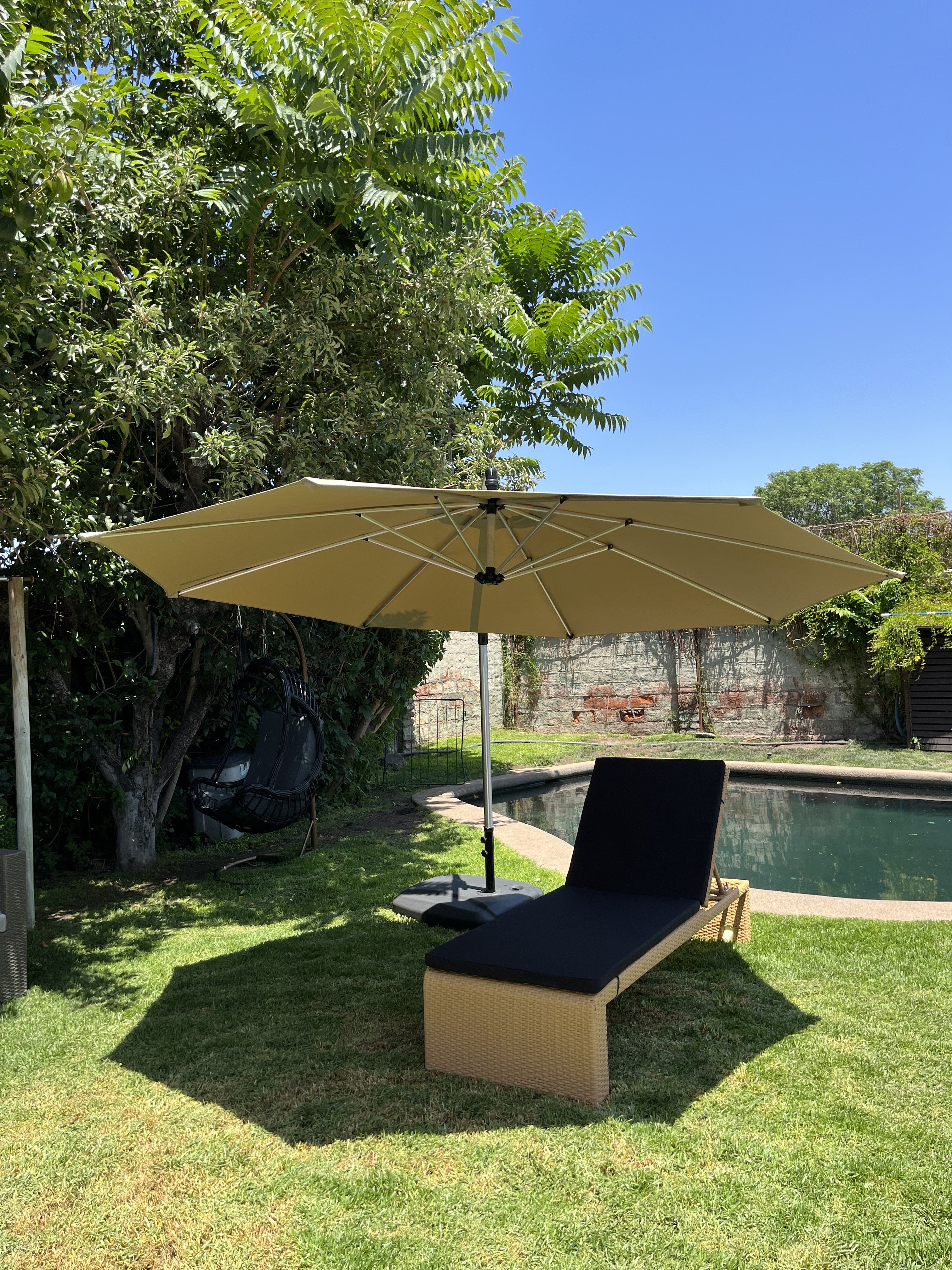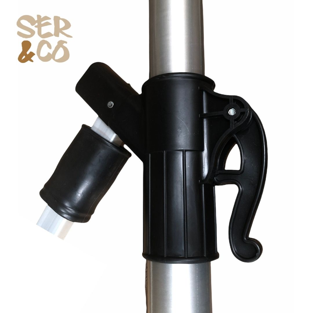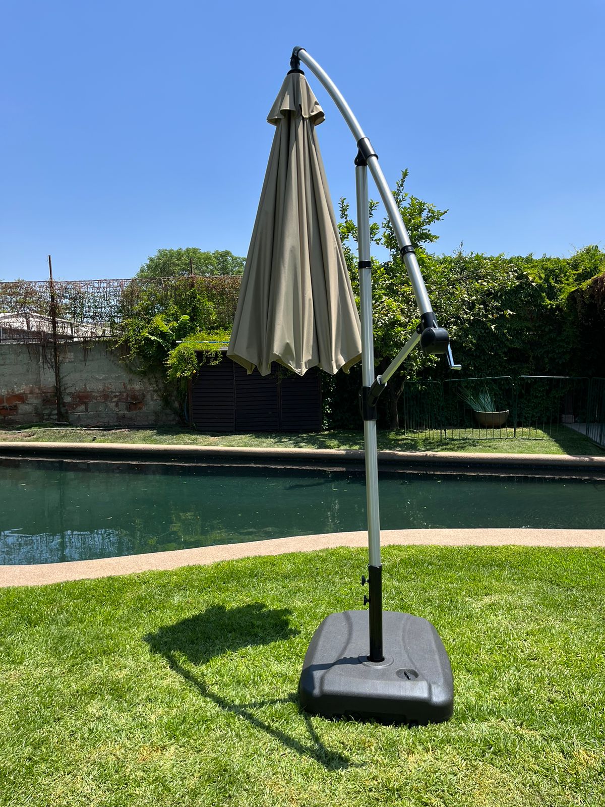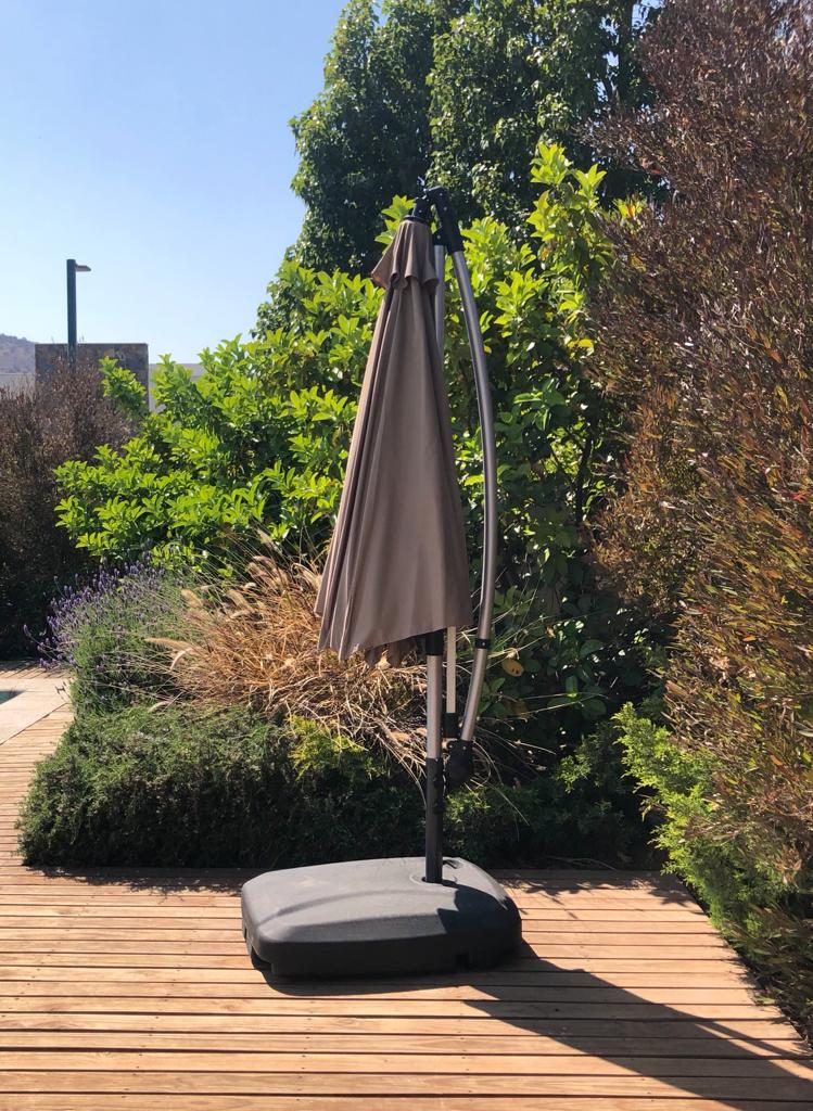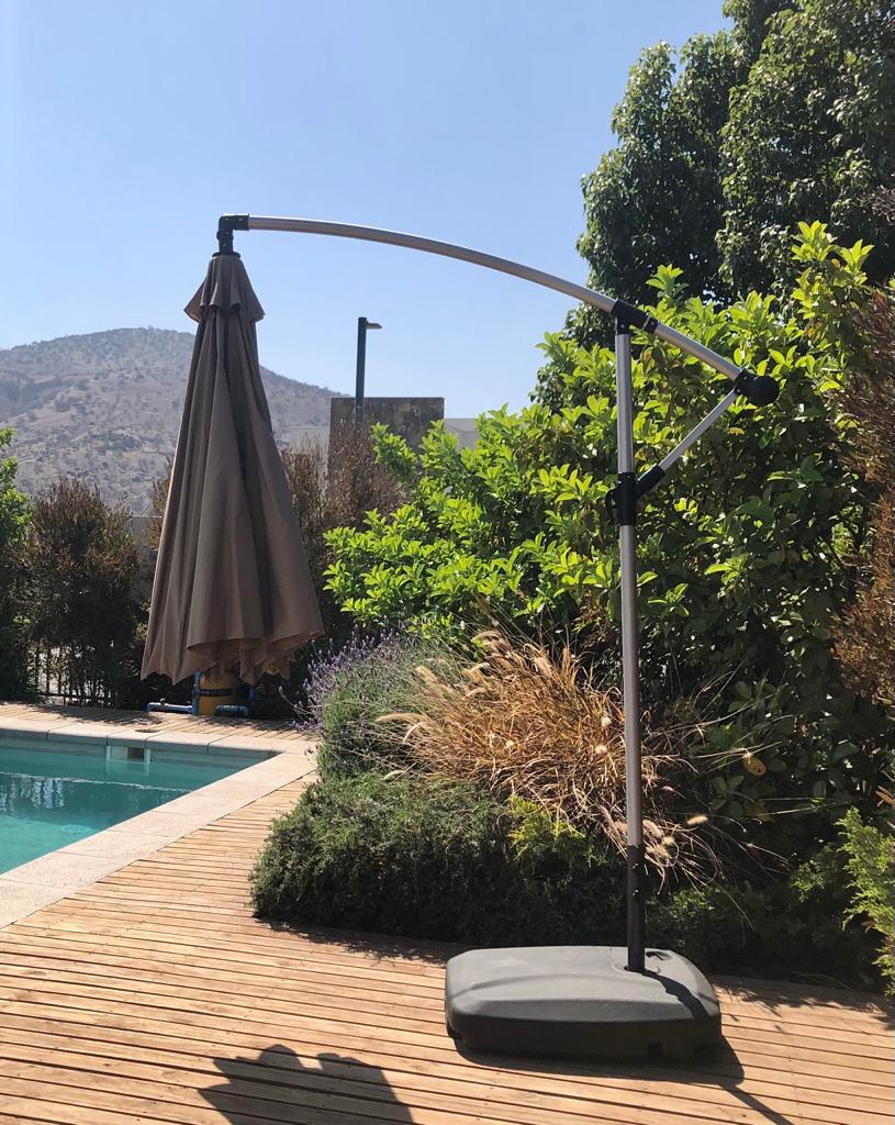 Quitasol 2.7 cm de diámetro con filtro UV tono Taupe. Base de polipropileno negro. De 62x81x17cm de alto , el cual se llena con arena ó agua (47lts) para dar soporte y peso.