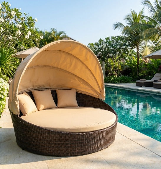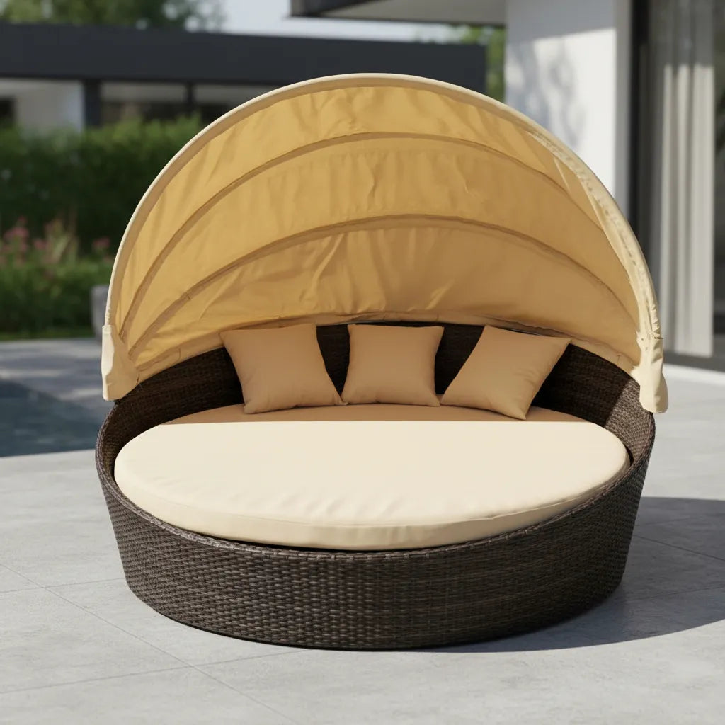 Materiales: Estructura interior metálica y tejido de ratán de PVC color café moro. Toldo retráctil ajustable de tela impermeable con filtro UV. Colchoneta y tres cojines de espuma en tela color taupé.
