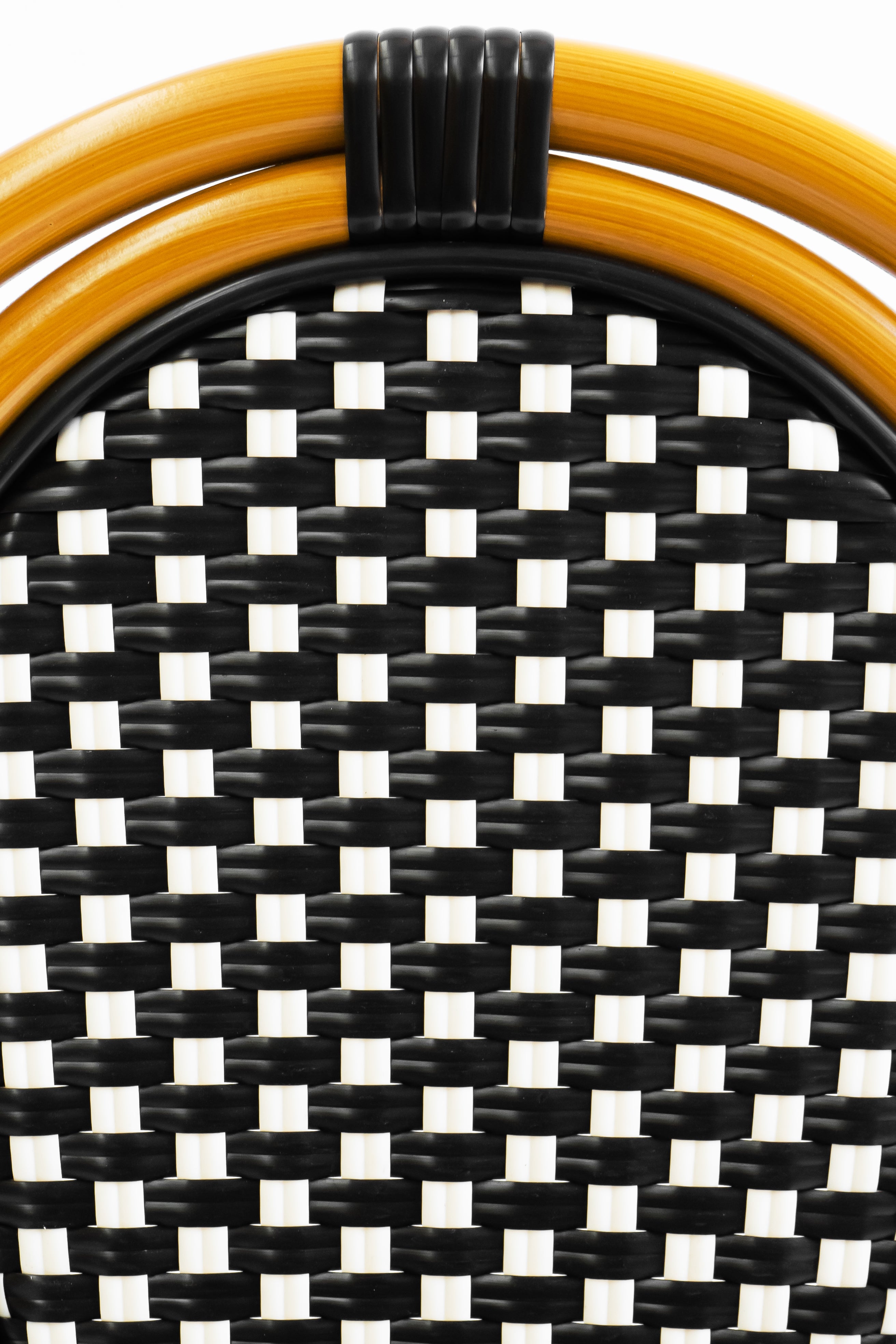 Materiales: Estructura de aluminio pintado tono bambú . Asiento y respaldo tejido de ratán de PVC negro y blanco.