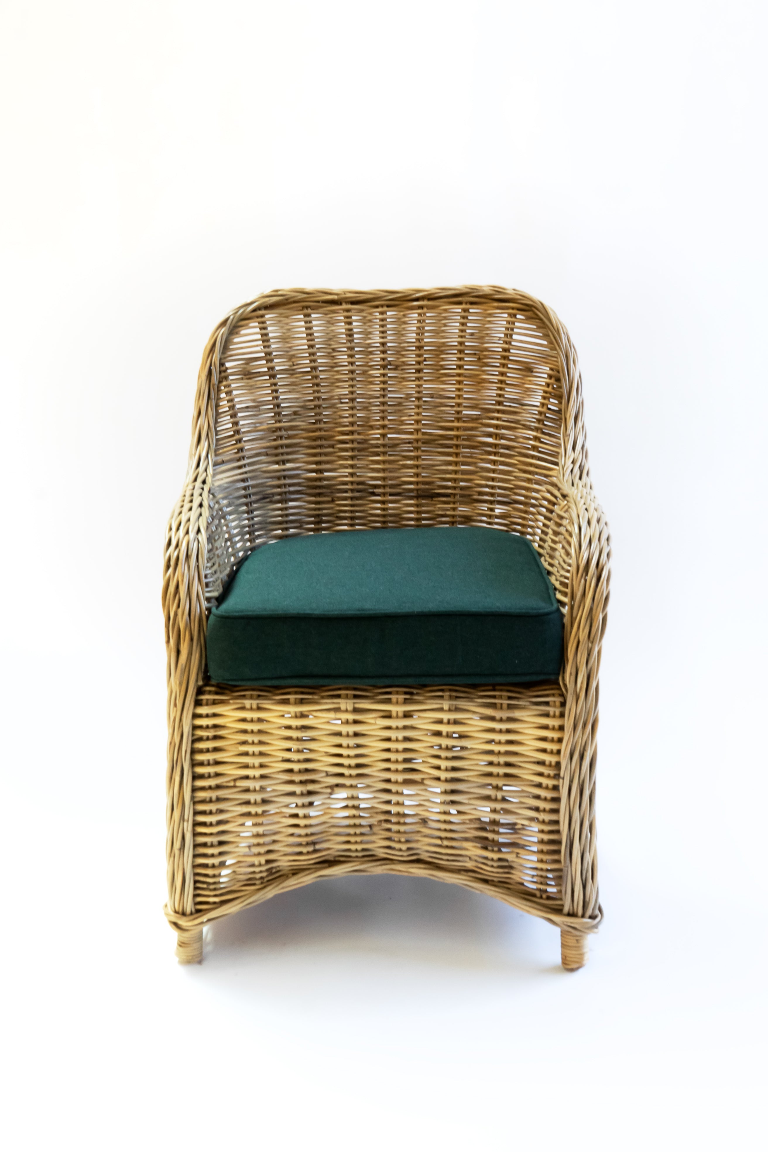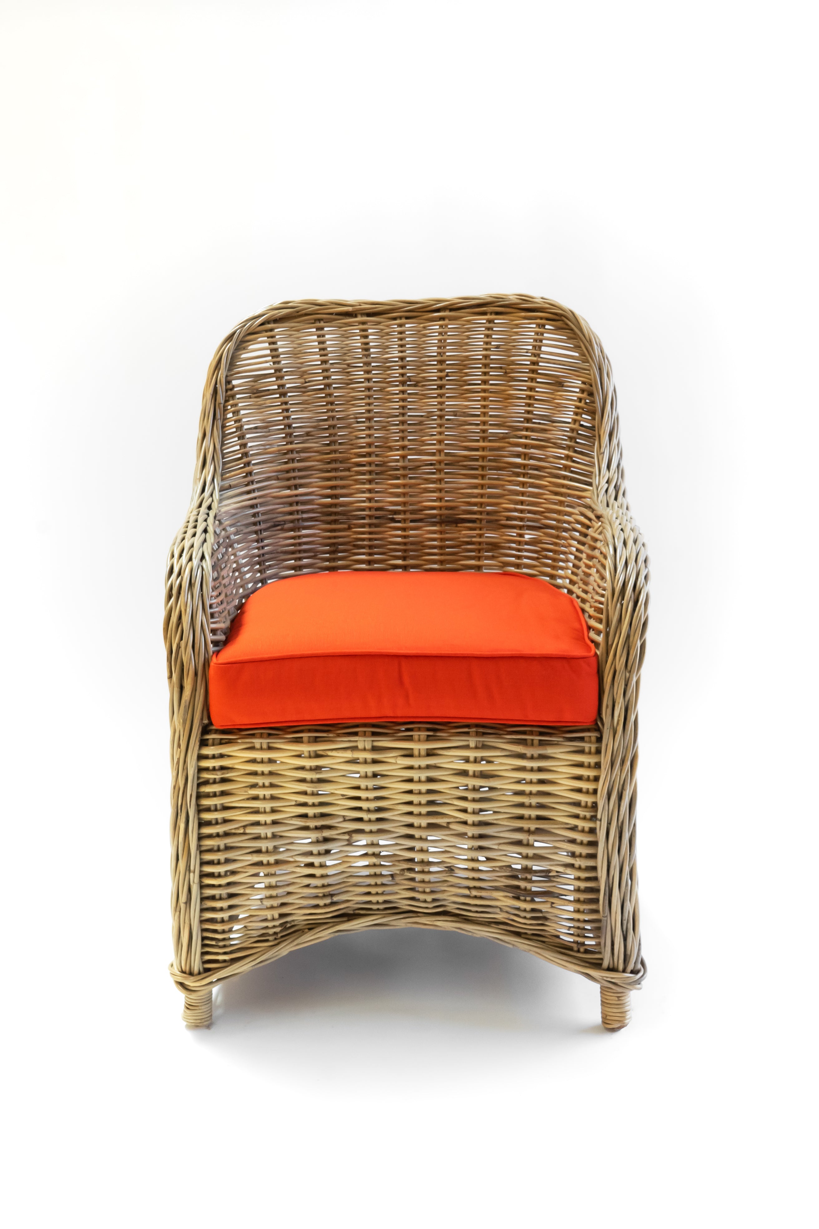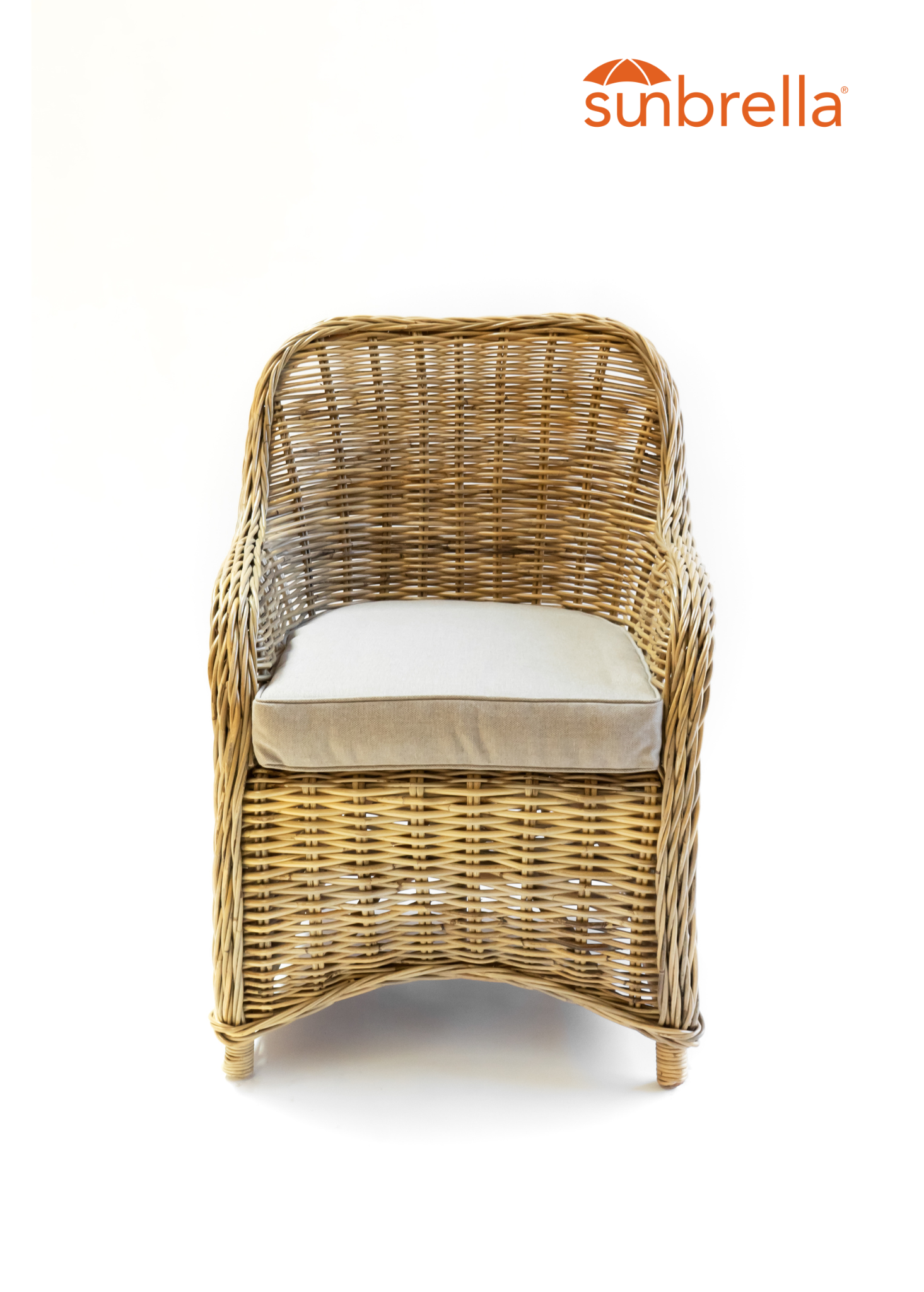 Materiales: Ratán Natural. Incluye cojín de 10 cm de espesor tapizado en tela Sunbrella.